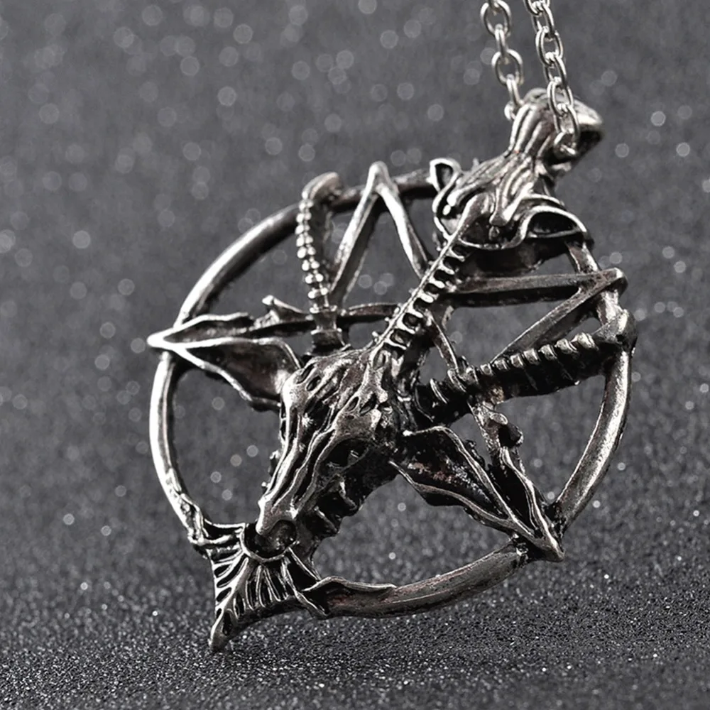 Name: Collar con colgante de cabeza de cabra y calavera de Dios, pentagrama Retro, suerte, satanismo, occulta, Metal, Vintage, plateado, Estrella